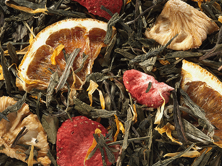 SASTOJCI: Zeleni čaj Sencha i bijeli čaj Pai Mu Tan (76%), listići manga, ananasa i narandže, sušeni komadi jagode, cvijet nevena, prirodna aroma
