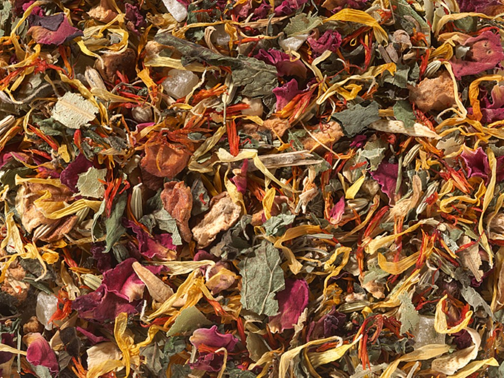 Sastojci: Kocke ananasa, kocke manga, komadići jabuke, komorač, listovi matičnjaka, cvjetovi srebrne lipe, latice ruže, šafranika, prirodna aroma, cvjetovi nevena, kora narandže.