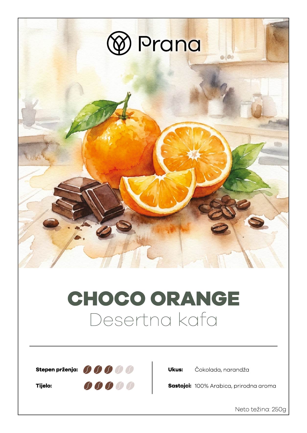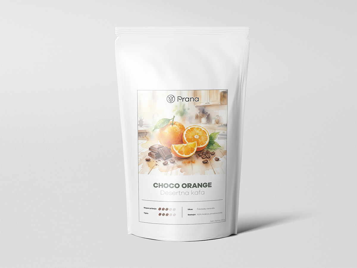 Choco Orange je desertna kafa koja spaja dva ukusa stvorena da idu zajedno. Zamislite mirisnu šoljicu vrhunske 100% Arabice obogaćenu “delikatno mekom aromom čokolade” i prirodnom “slatkoćom zrelih narandži” (sweetness of ripe oranges). Ova kafa nije samo napitak, već “izvanredna harmonija” (outstanding harmony) koja podsjeća na omiljene čokoladne poslastice sa citrusnim punjenjem.